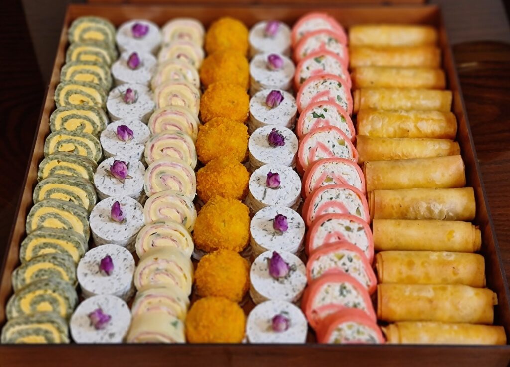 شامل:اسپرینگرول، رول کوکو سبزی با پنیر گودا ، راتا پنیر گردو ، شات سالاد آلمانی ، راتا اسفناج ، راتا روسي، توپک مرغ آجیلی