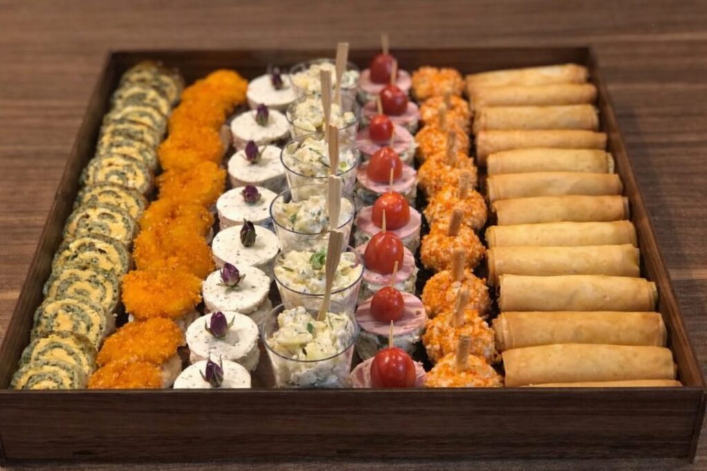 شامل :رول کوکوسبزی،راتا پنیر و گردو،اسپرینگرول سبزیجات، سالاد آلمانی،توپک سیبزمینی پنیری سوخاری، راتا اسفناج و پنیر