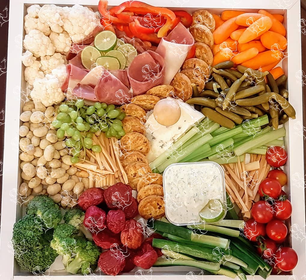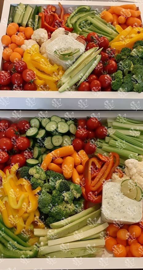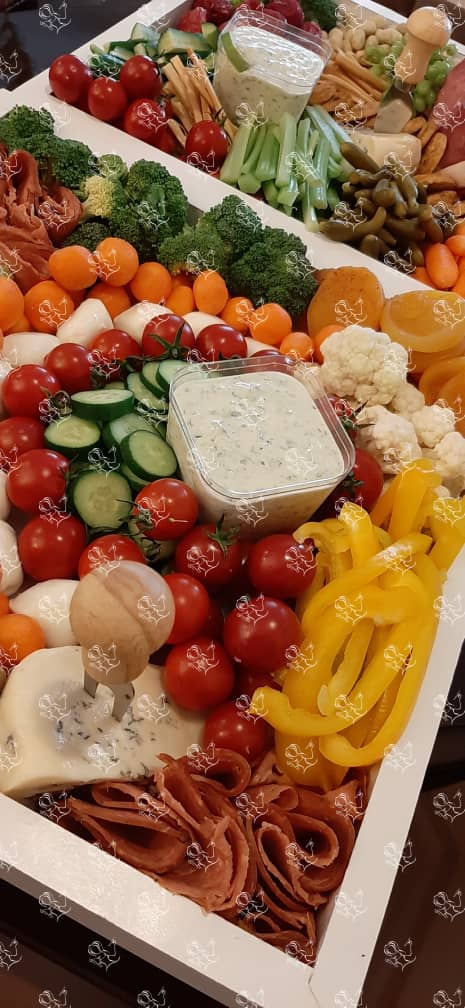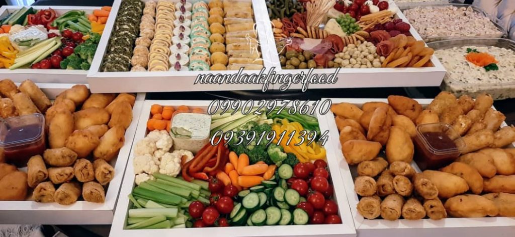 سینی مزه پنیر و سبزیجات با دیپ مخصوص نانداک، سینی های فینگرفود سوخاری قارچ و پنیر پیراشکی پیتزایی سالاد الویه سالاد ماکارونی